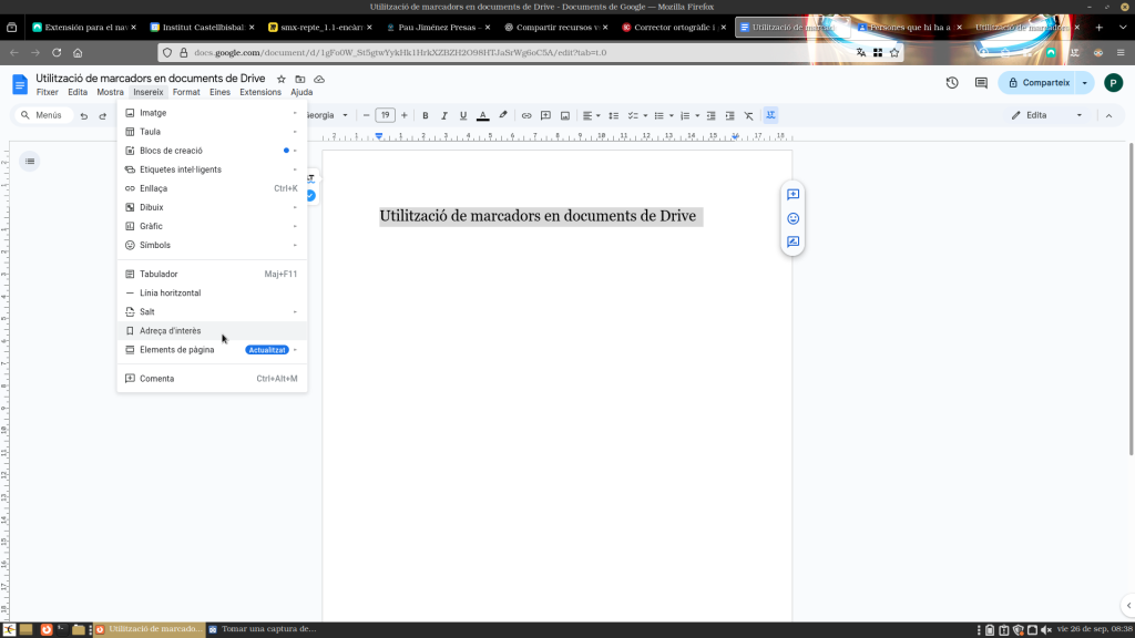 Seguit anem al menú a la part superior i entrem a “Insereix” on trobarem l’apartat “Adreça d’inters” i farem clic.