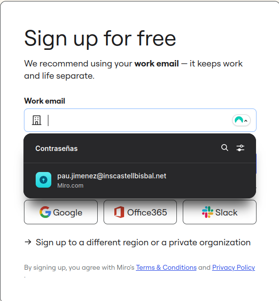 Primer de tot entrem a la pàgina de Miro i donem clic a “Iniciar Sessió”, ens demanarà el correu amb el qual volem iniciar sessió, jo com tinc la contrasenya desada al gestor de contrasenyes no he d’escriure-ho.