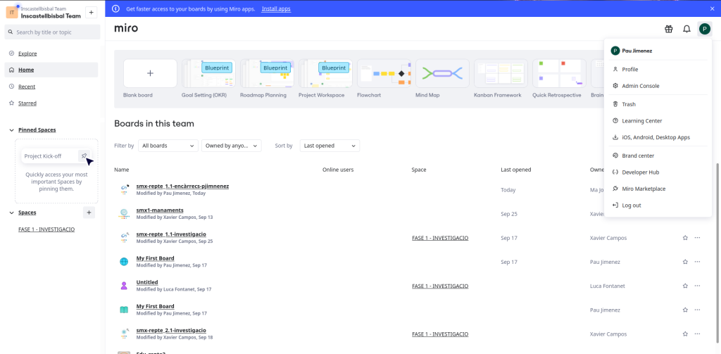 Per tenir accés a Miro vam rebre un correu de part del Xavi per poder iniciar sessió la primera vegada, però una vegada iniciada la sessió el procés canvia.