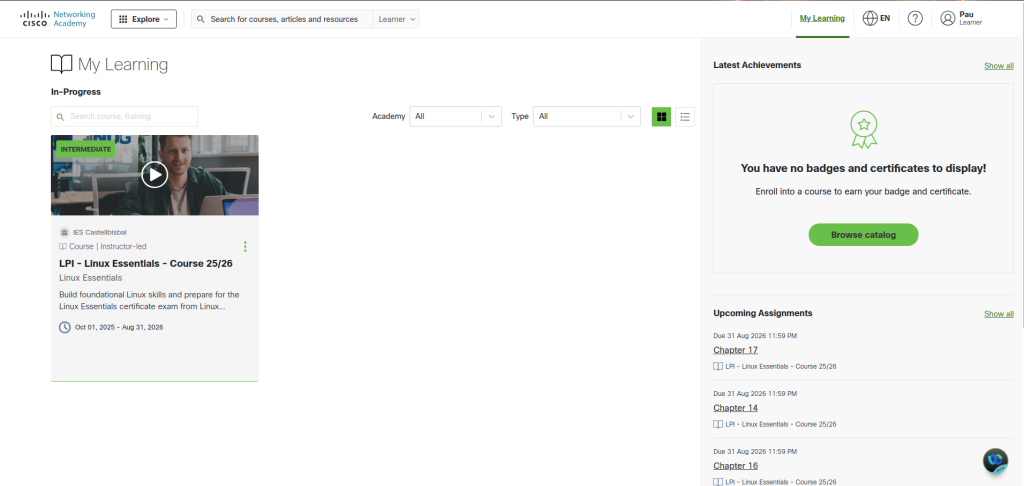Finalment, al donar clic a “Iniciar sessió” entrarem a la nostra pàgina personal de Netacad.