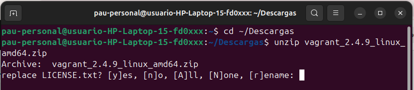 Com volem descomprimer l’arxiu .zip escribim el següent.