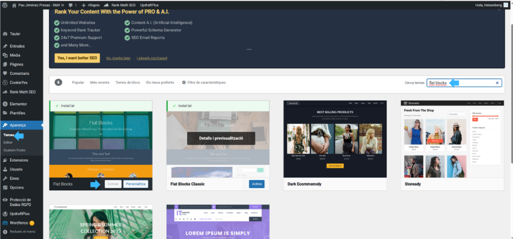 En entrar als apartats Aparença > Temes. Dintre de “Temes” he buscat a la barra de recerca “Flat Blocks” que és com es diu el tema que he escollit, en fer la recerca ens sortiran els diferents temes amb aquest nom. Allà farem clic a “Instal·lar” i després a “Activar”. Instal·lar > Activar.