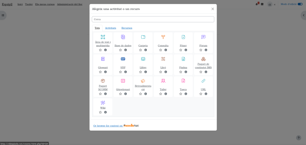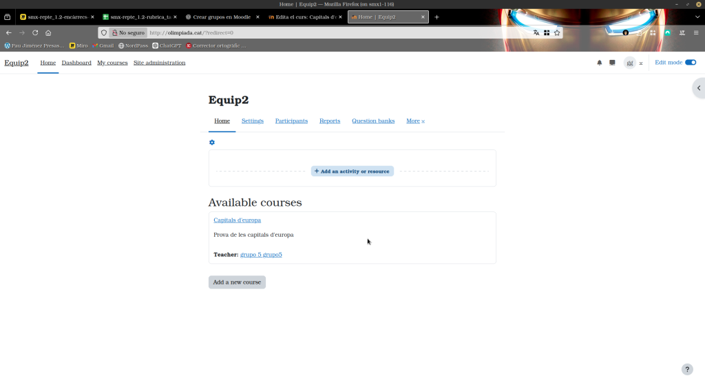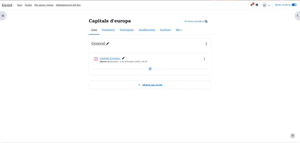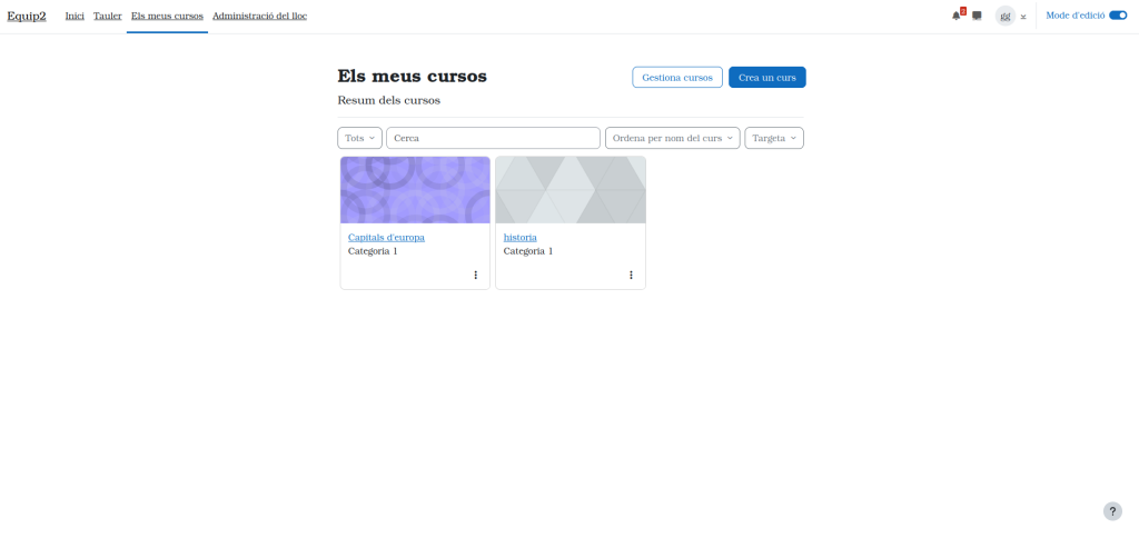 Una vegada a “Els meus cursos” he entrat al curs que ja he creat previament.