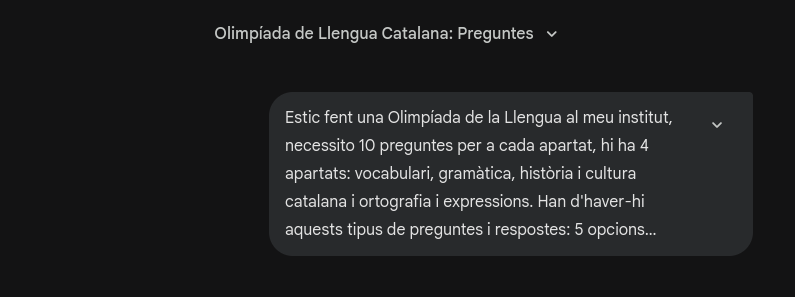 Per aquest encàrrec he hagut de crear proves lingüístiques per a la Olimpíada de la Llengua, les preguntes havien de ser variades, no molt difícils, ja que les havien de poder respondre alumnes de 1r d’ESO fins a 4t, com sabia que fent-les jo i pensant una a una trigaria molt, li he demanat ajuda a la IA. En aquest cas he utilitzat l’eina ChatGPT.