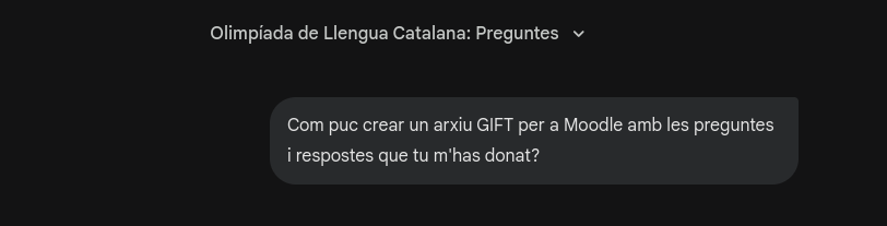 Una vegada fetes les preguntes i respostes i corregides perquè no hi hagués cap error, li vaig demanar que volia aquelles preguntes i respostes en un arxiu GIFT per poder aplicar-lo al Moodle: