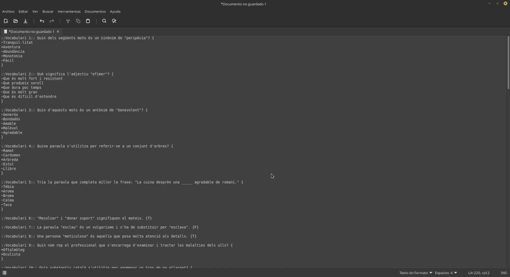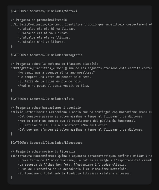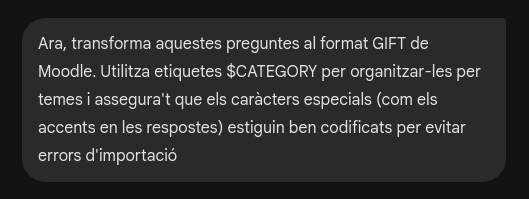 Una vegada fetes les preguntes i respostes i corregides perquè no hi hagués cap error, li vaig demanar que volia aquelles preguntes i respostes en un arxiu GIFT per poder aplicar-lo al Moodle: