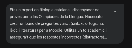 Per aquest encàrrec he hagut de crear proves lingüístiques per a la Olimpíada de la Llengua, les preguntes havien de ser variades, no molt difícils, ja que les havien de poder respondre alumnes de 1r d’ESO fins a 4t, com sabia que fent-les jo i pensant una a una trigaria molt, li he demanat ajuda a la IA. En aquest cas he utilitzat l’eina ChatGPT.