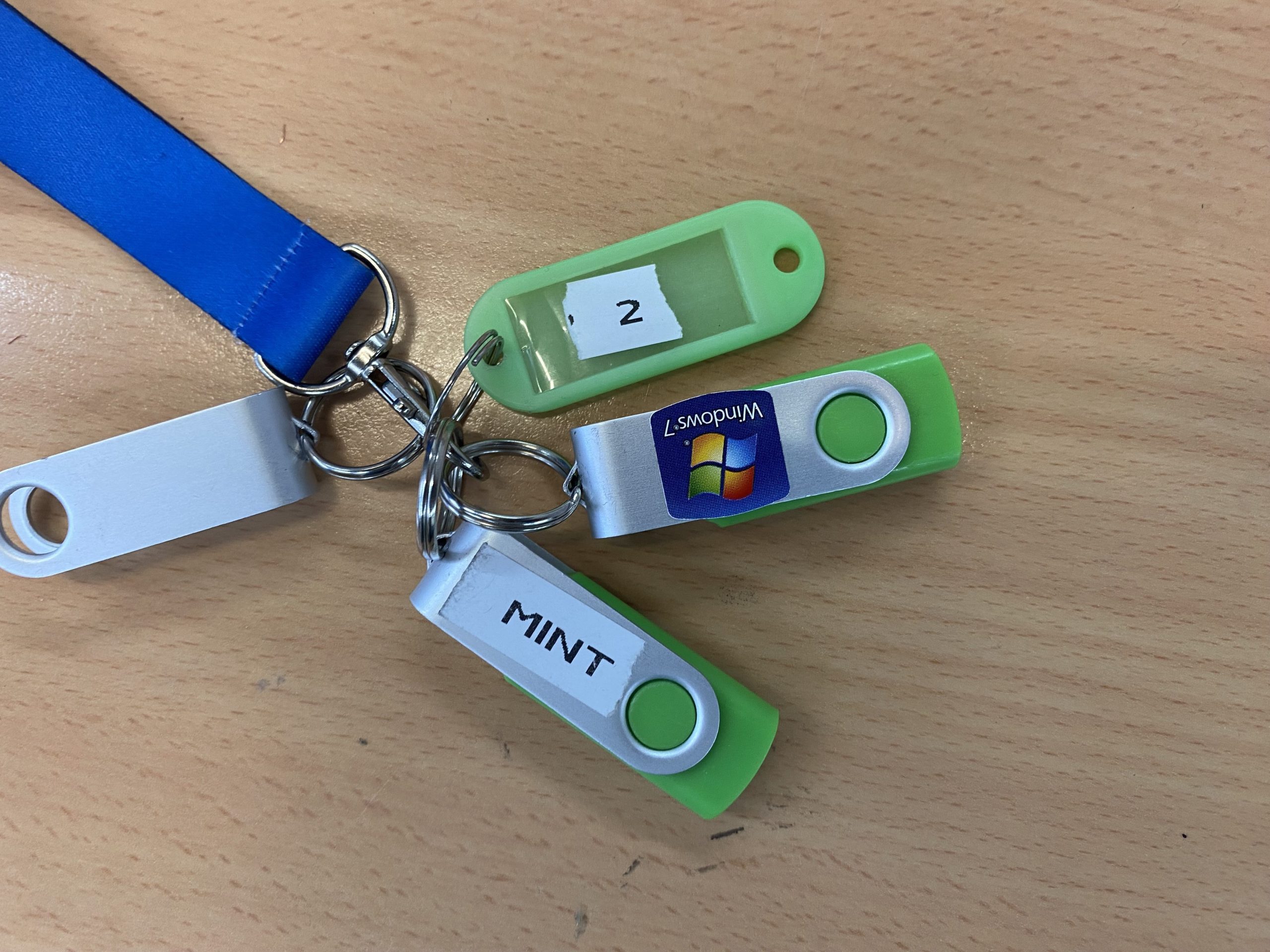 Cada grup tenim 3 PEN USB, en el nostre cas un dels nostres està en reparació, he etiquetat cada USB amb el qual contenen en l’interior, per exemple n’hi ha un que té Linux Mint i per això de la seva etiqueta. Aquests USB tenen una capacitat de 32 GB, tenim 3 sumem la quantitat de 96 GB de memòria que podem utilitzar.