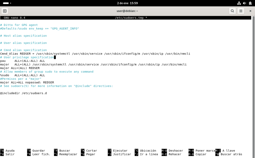 En la imatge anterior ja es poden observar els privilegis modificats, on l’usuari “pau” té tots els privilegis “ALL=(ALL:ALL) ALL, l’usuari “super”no en té, l’usuari major només té privilegis per gestionar la xarxa del SO i els serveis ALL=(ALL) REDSER, i per últim l’usuari “root” al qual li he tret els permisos.