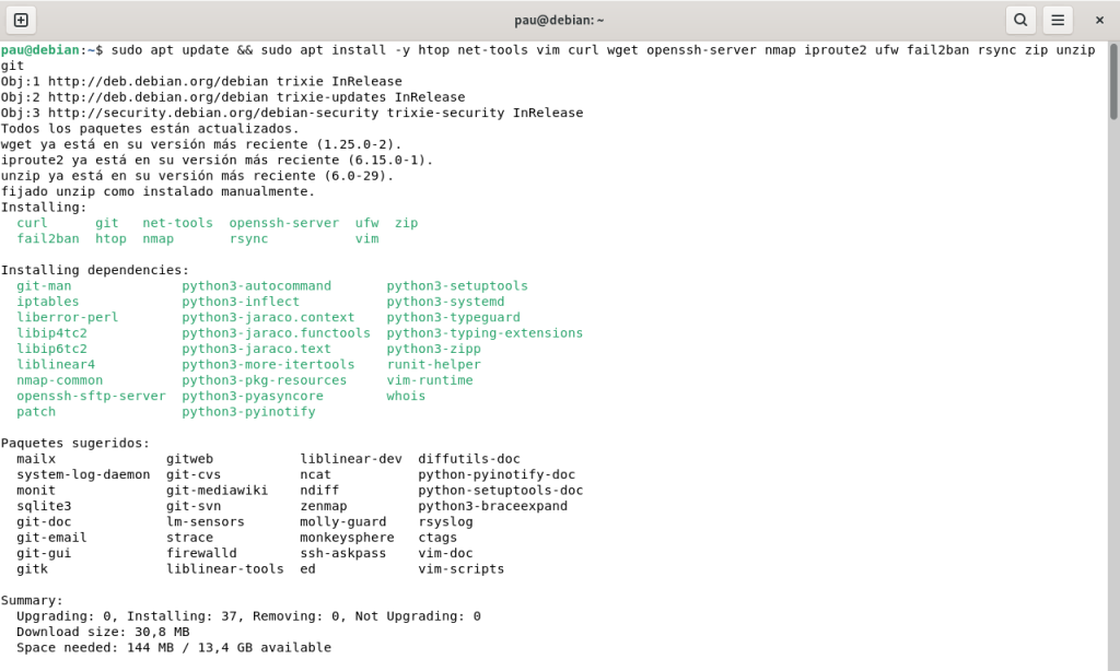 sudo apt update && sudo apt install -y htop neofetch net-tools vim curl wget openssh-server nmap iproute2 ufw fail2ban rsync zip unzip git