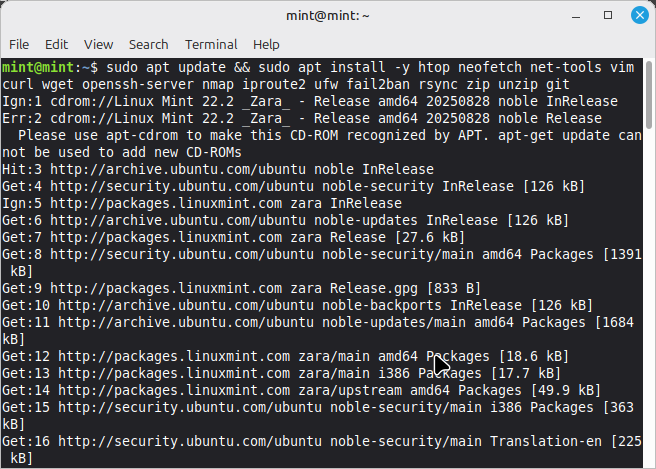 sudo apt update && sudo apt install -y htop neofetch net-tools vim curl wget openssh-server nmap iproute2 ufw fail2ban rsync zip unzip git