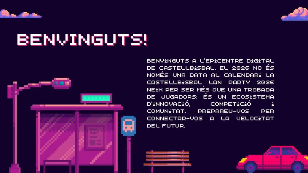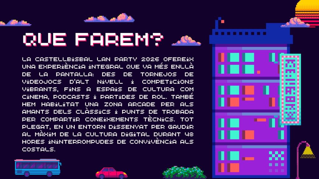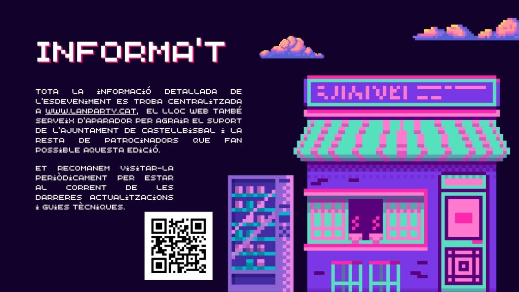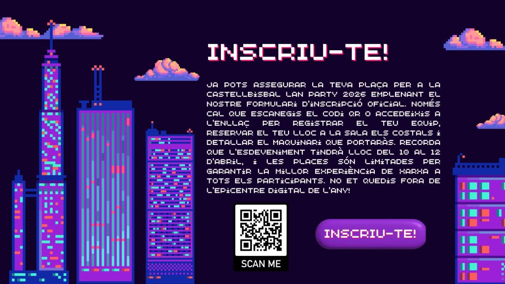Per informar als participants he hagut de crear una presentació multimèdia amb la informació més important i amb els enllaços a la pàgina web i el formulari de registre. He escollit una plantilla de Canva amb un estil àrcade.