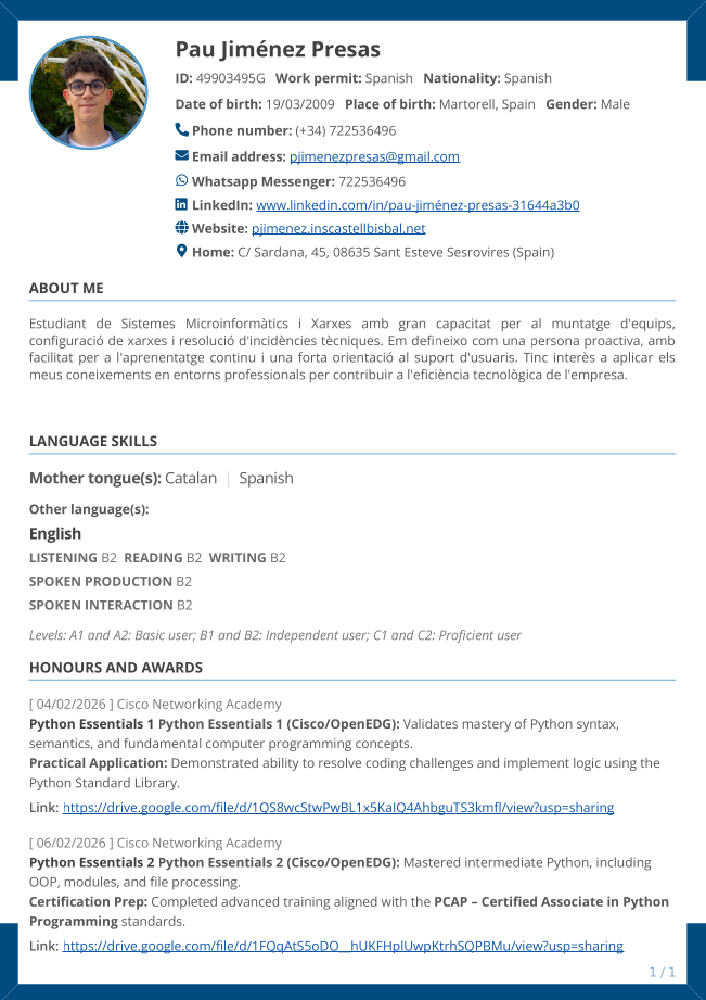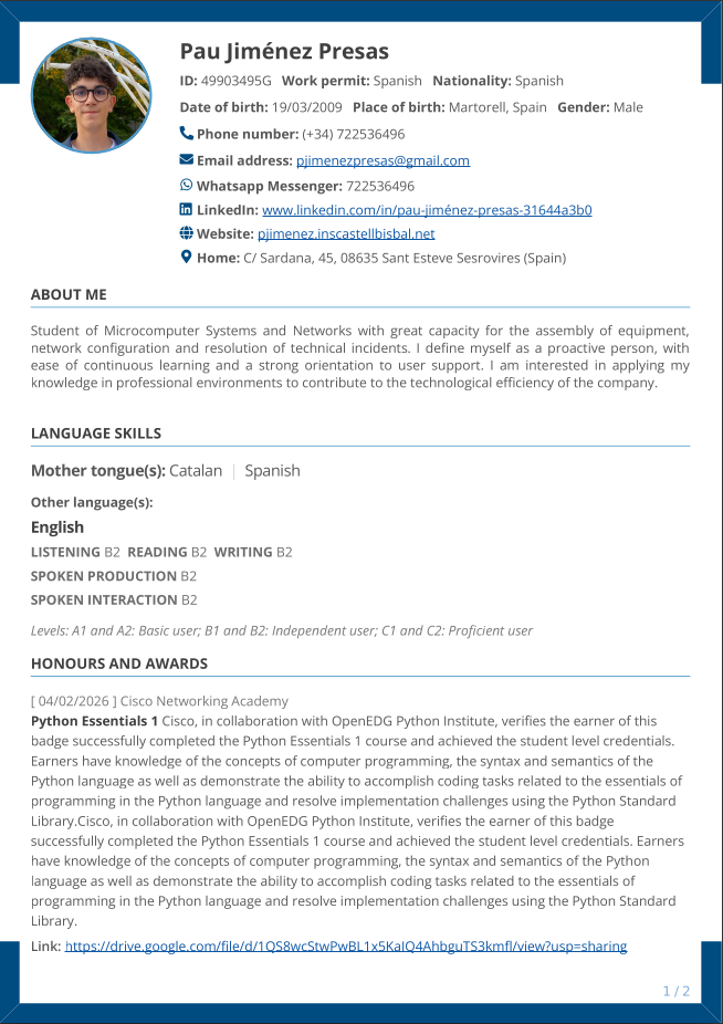 En la Unitat 5 he fet el meu Currículum Vitae i la meva marca personal. He après a crear un logotip que representi el meu perfil (U TECH) i a organitzar tota la meva experiència i certificacions, com les de Python de Cisco, en un format professional i clar.