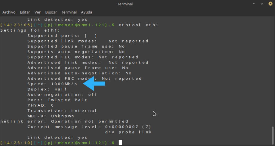 Prova de velocitat a Linux: Mitjançant la terminal, hem comprovat que la targeta de xarxa ha negociat una velocitat de 1000 Mb/s (Gigabit). Així amb cada cable.