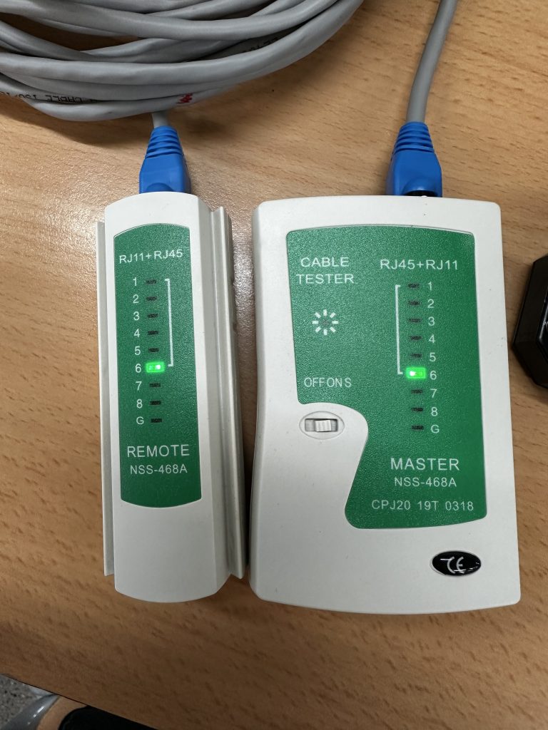 Prova de continuïtat: Hem passat el tester de xarxa confirmant que els 8 fils fan contacte correctament en l’ordre establert.
