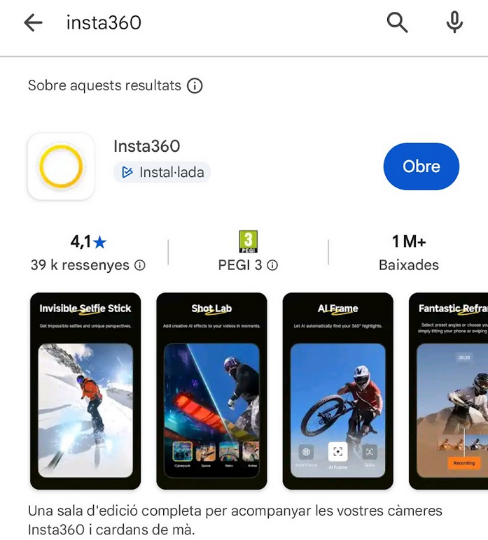 - Captura i “Stitching”: S’ha utilitzat l’aplicació oficial Insta360 (Vegeu imatge 2), instal·lada al dispositiu mòbil per a controlar la càmera via Wi-Fi. Aquesta app també s’encarrega de realitzar el “stitching” automàtic (la unió de les dues imatges de 180° de les lents frontals i posteriors) per a crear una imatge equirectangular inicial.