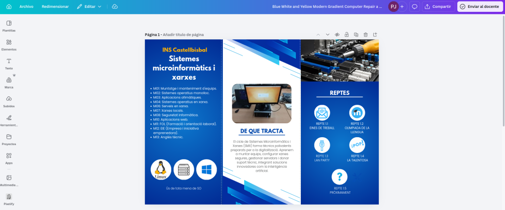En el fulletó hem posat les assignatures oficials (mòduls), però també hem explicat que treballem per reptes, com el de la IA (Xatbot) o el Tour Virtual, que són coses més pràctiques. També hem afegit un apartat sobre com ens avaluen amb la teranyina de capacitats, per explicar que no només busquem una nota, sinó millorar cada dia les nostres habilitats com a tècnics.