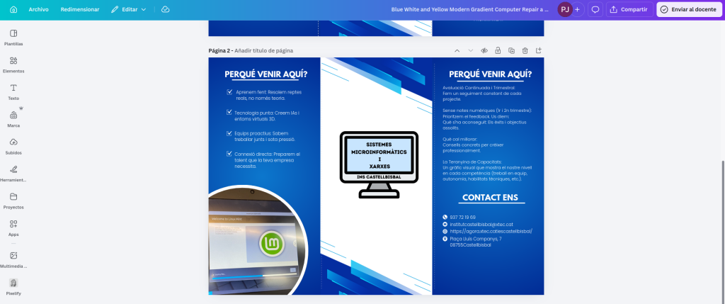 El fulletó s’ha fet amb el Canva i hem vigilat que les imatges tinguin bona qualitat i que tot estigui ben quadrat. Hem posat també la informació de les pràctiques (hores i quan podem començar) perquè és el que les empreses més ens preguntaran.