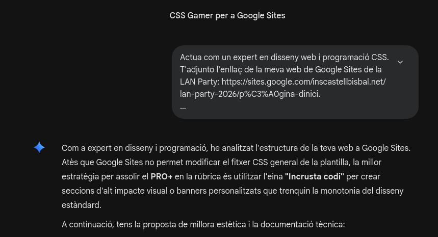 Actua com un expert en disseny web i programació CSS. T'adjunto l'enllaç de la meva web de Google Sites de la LAN Party: https://sites.google.com/inscastellbisbal.net/lan-party-2026/p%C3%A0gina-dinici.