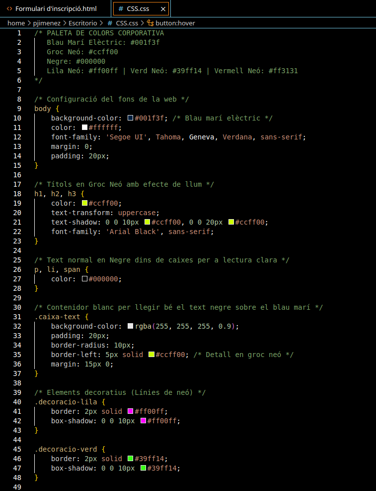 Prepara la Justificació Tècnica: Escriu un paràgraf per a la rúbrica explicant per què aquest CSS és professional, esmentant el contrast, la llegibilitat i la identitat visual.