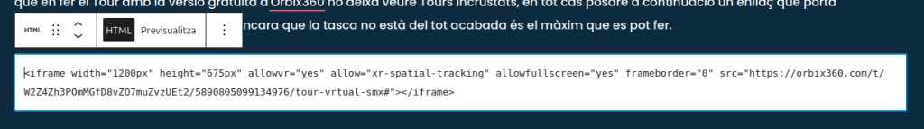 Per poder “incrustar” el Tour al WordPress, he utilitzat l’opció d’afegit “HTML personalitzat” on he enganxat el codi HTML que et proporciona el mateix Orbix.