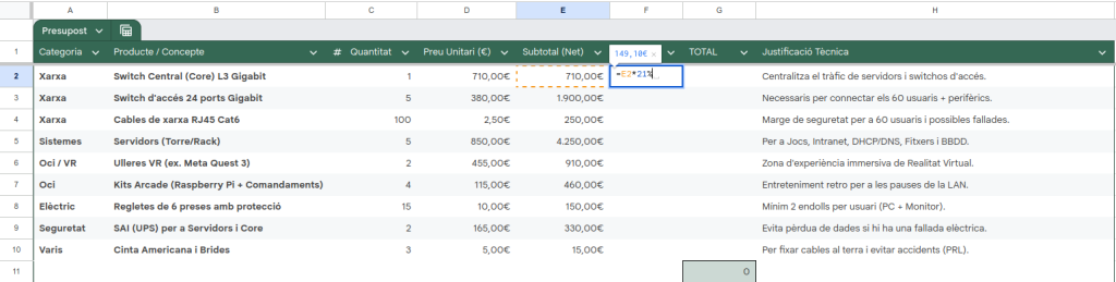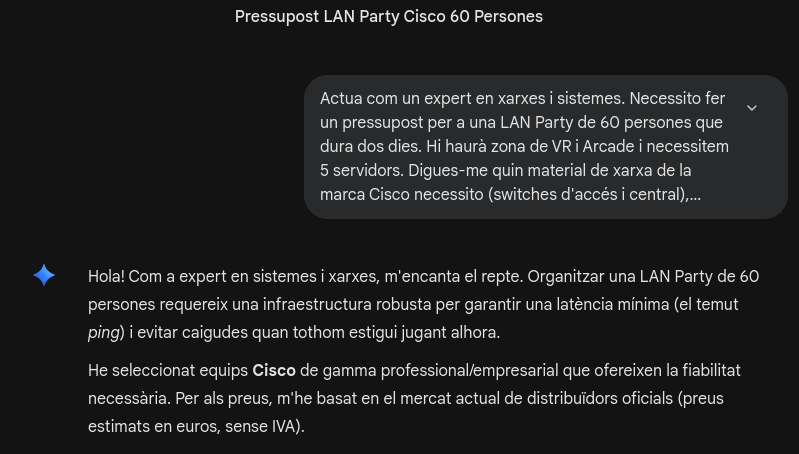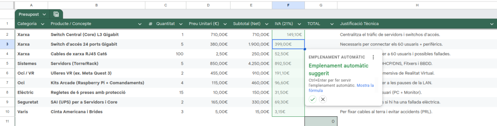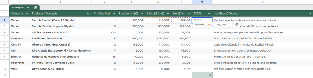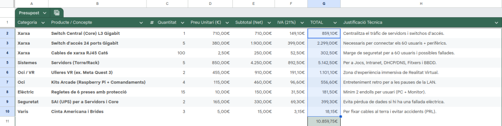 Per fer aquesta tasca, primer vaig fer una llista del que pensava que necessitàvem. Després, vaig utilitzar la IA Gemini per confirmar si el material era l’adequat per a 60 persones i per saber els preus actuals de mercat de la marca Cisco, que és la que volíem fer servir. Amb la informació que em va donar la IA, vaig muntar el full de càlcul, vaig aplicar les fórmules per a l’IVA i vaig treure el pressupost final.